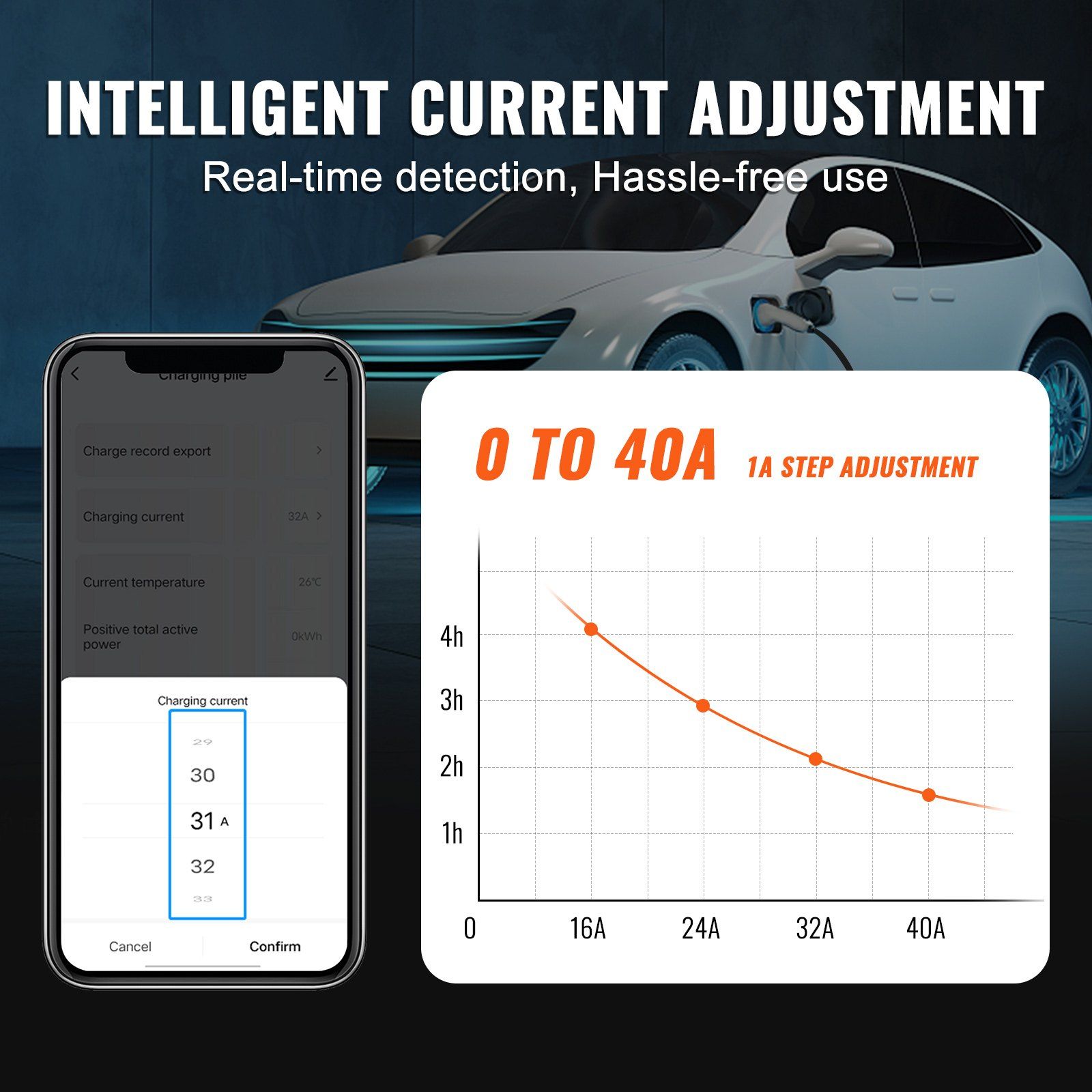 1.Intelligent Recognition Function: Our EV charging station level 2 can intelligently identify the user's home circuit. If the circuit can not withstand the charging power, it will automatically switch to the appropriate power charging. You won't have anything to worry about! Adjustment Unit: 1A, adjustment Range: 0-40A.