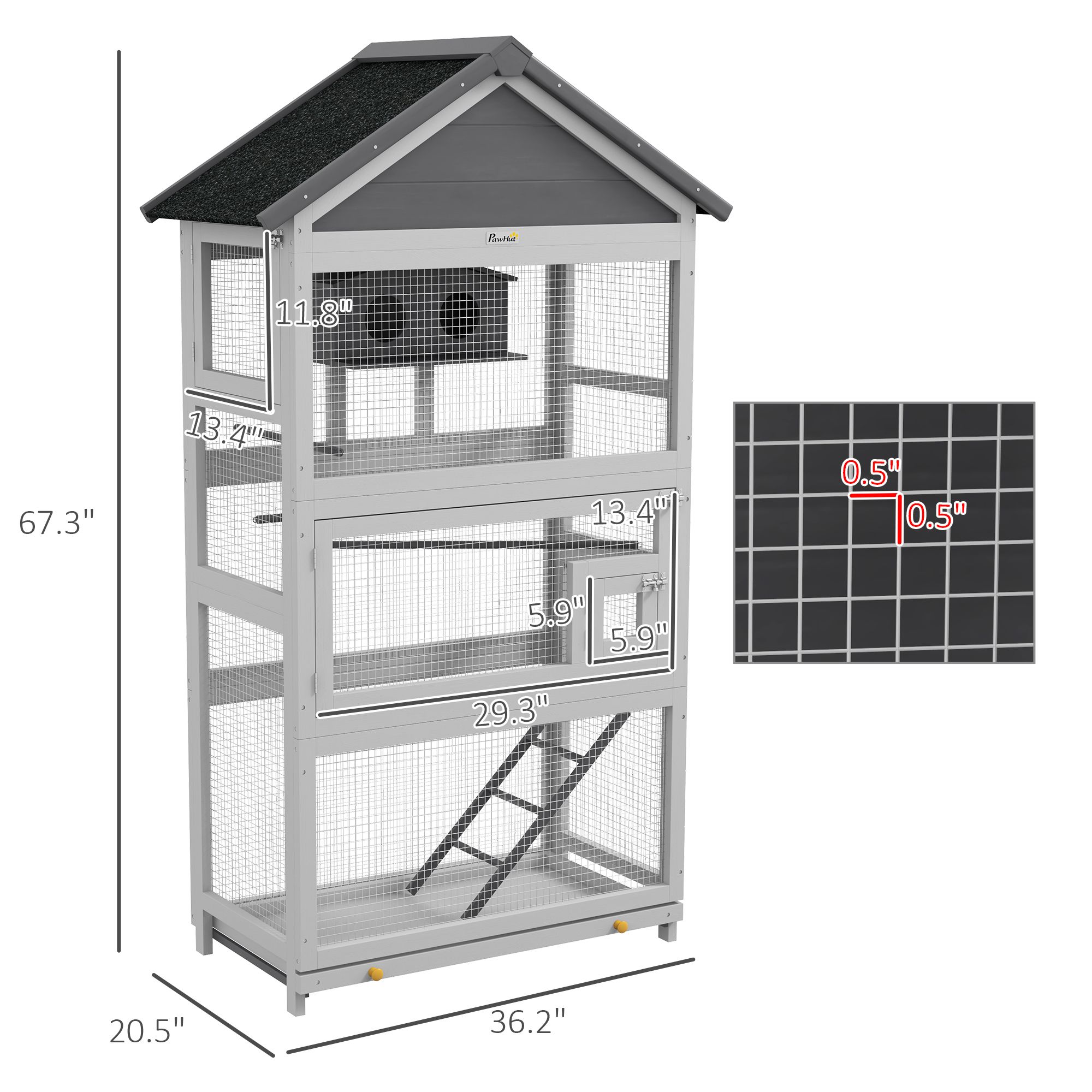 5.- Outdoor Bird Aviary Info: Overall Dimensions: 36.2" L x 20.5" W x 67.3" H. Cage Inner Space: 30.7" L x 16.3" W x 63.8" H. Assembly required..