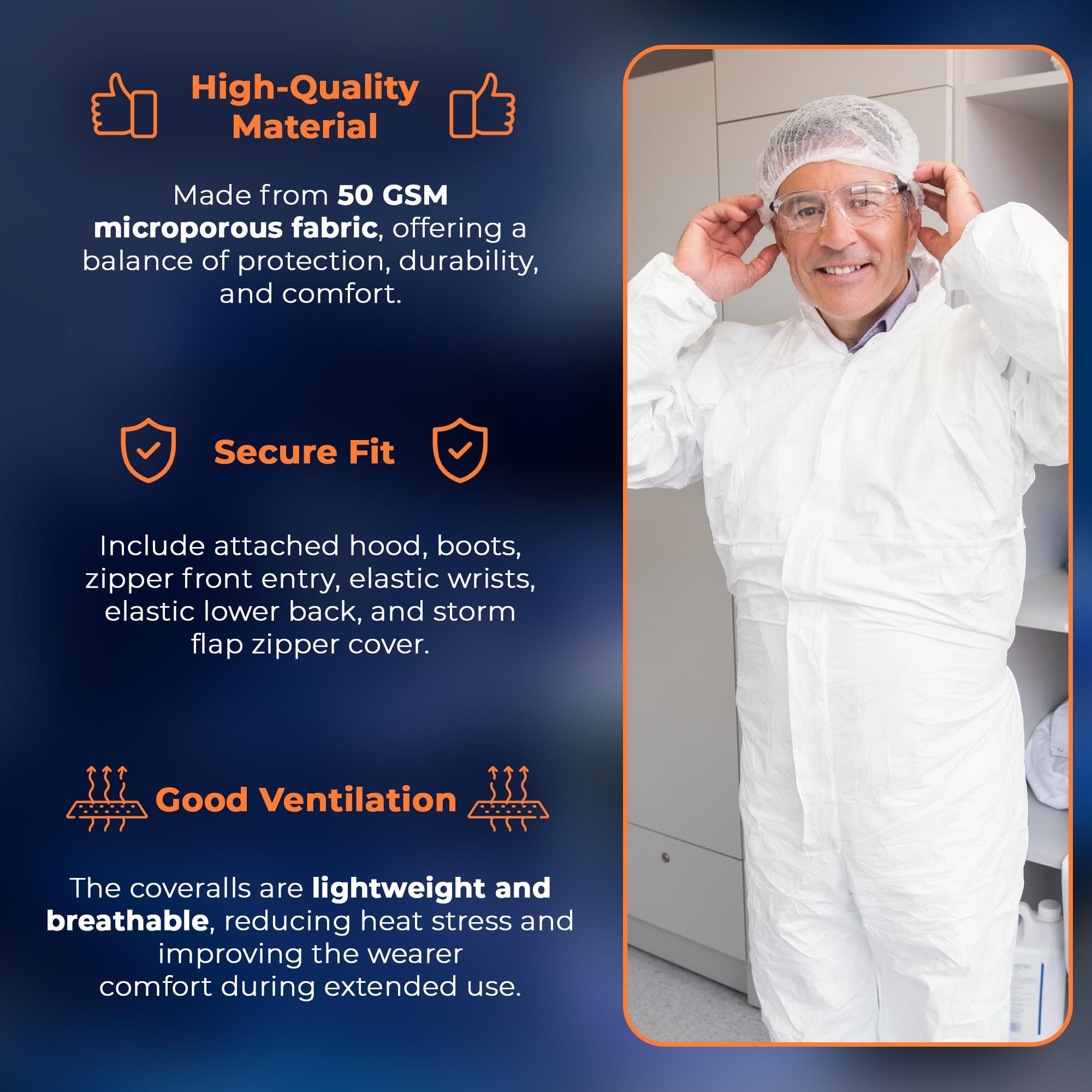 Disposable Coveralls with Hood, Boots M. 50 Pack White Paint Coveralls Disposable. Microporous 50 GSM Liquid-Proof Hazmat Suits Disposable