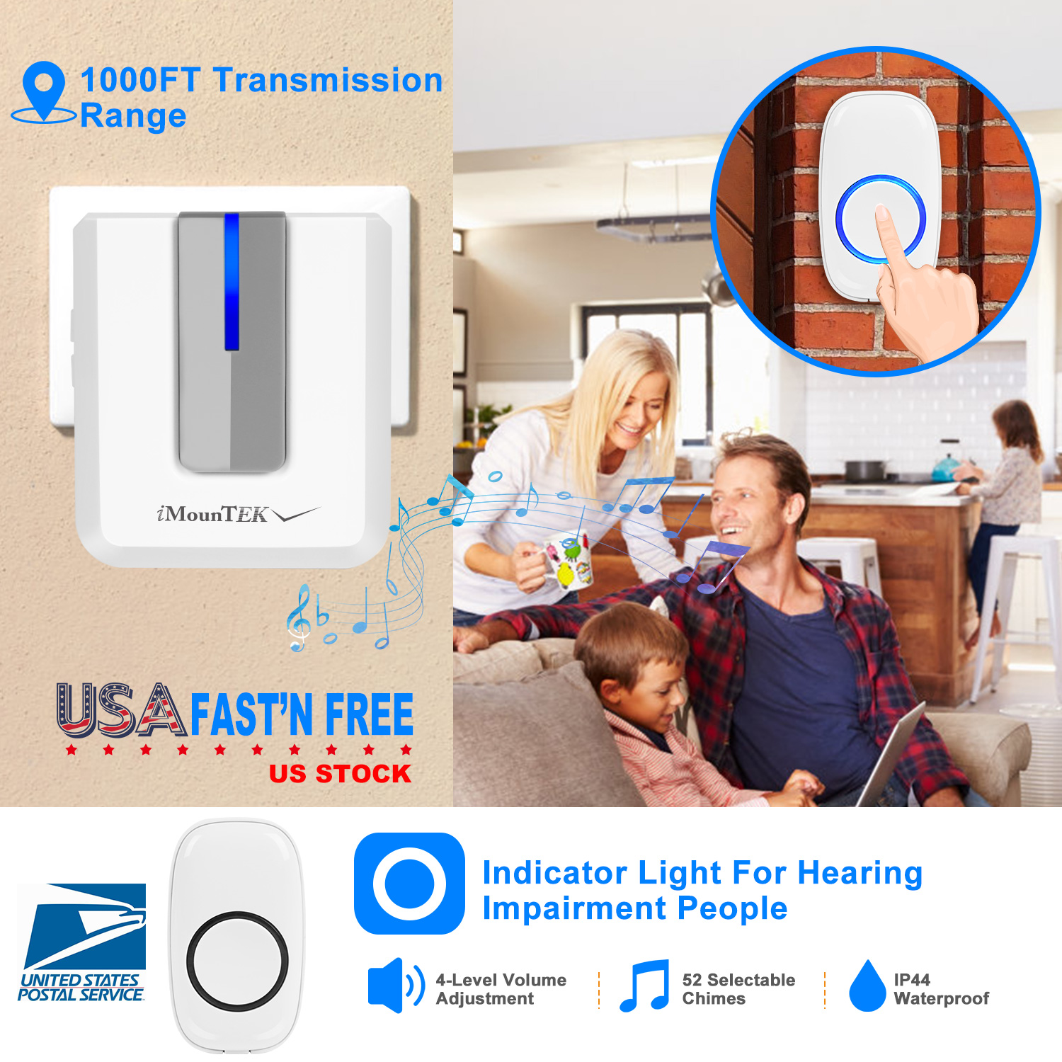 Our wireless doorbells, featured with low-power consumption, energy-saving and environmentally-friendly. With 1000FT long operating range, 4 adjustable volumes and 52 melodies, plug receivers will remind you in time when someone visits your home and will never miss a visitor. One transmitter can pair to more than one receivers and one receiver can pair to more than one transmitters. Bring much convenience for your multiple rooms design house. Widely used in your home, apartment, office, warehouses and etc. Abrasion resistant transmitter and receiver with IP44 waterproof performance can serve you longer, even in outdoor use. Easy to install and widely used in in front door, baby room, office and warehouse, etc..