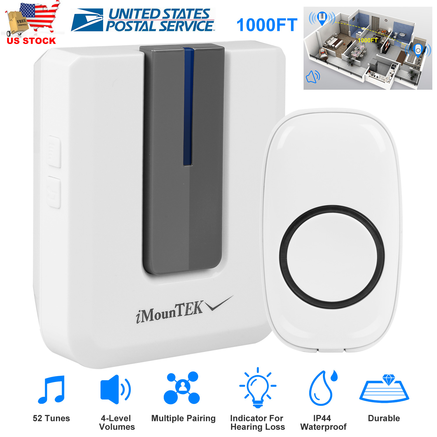Home > Wireless Doorbells Rings 1000FT Operating Range IP44 Waterproof Door Chime W/ 1 Plug Receiver Chimes 52 Melodies LED Indicator Bells for Office Apartm