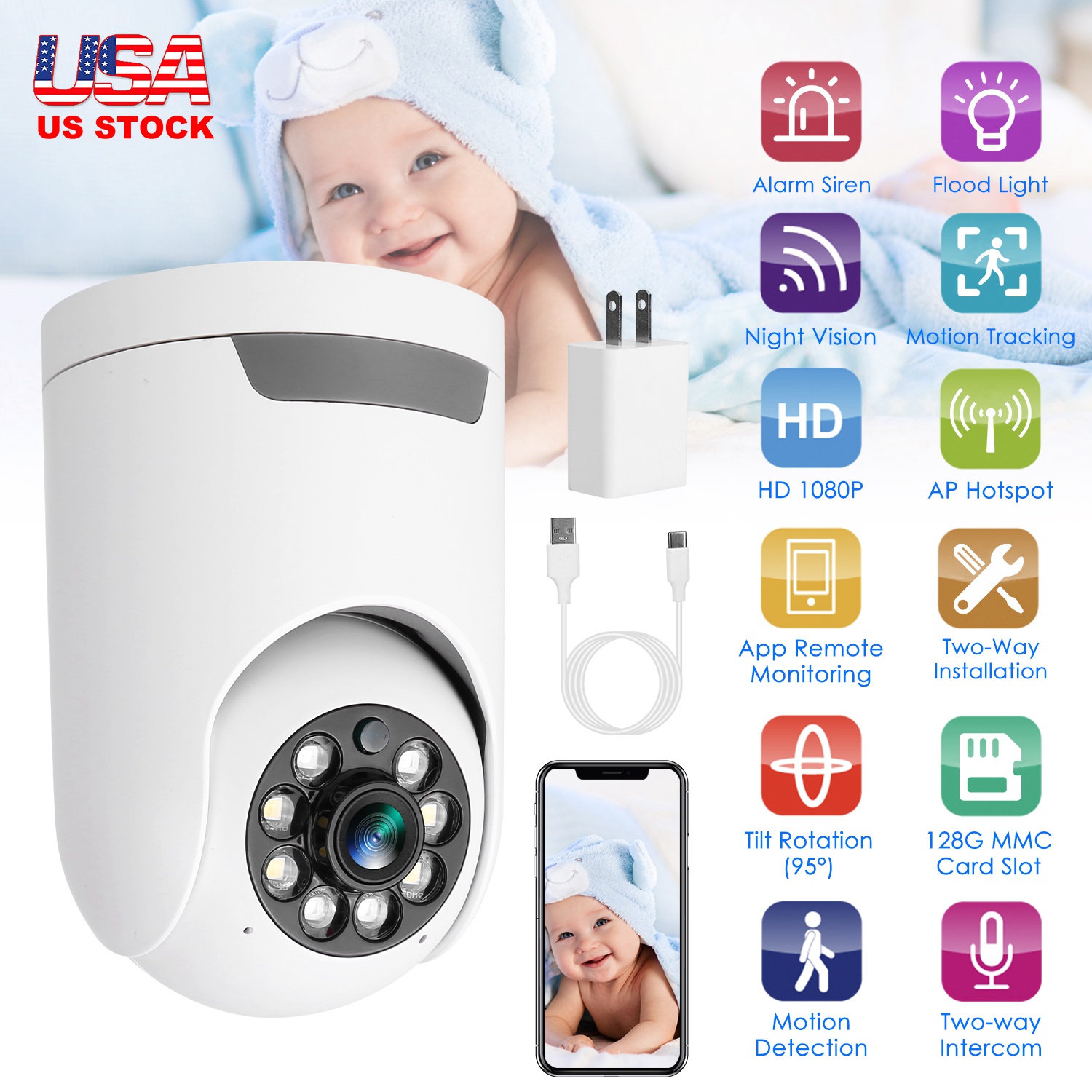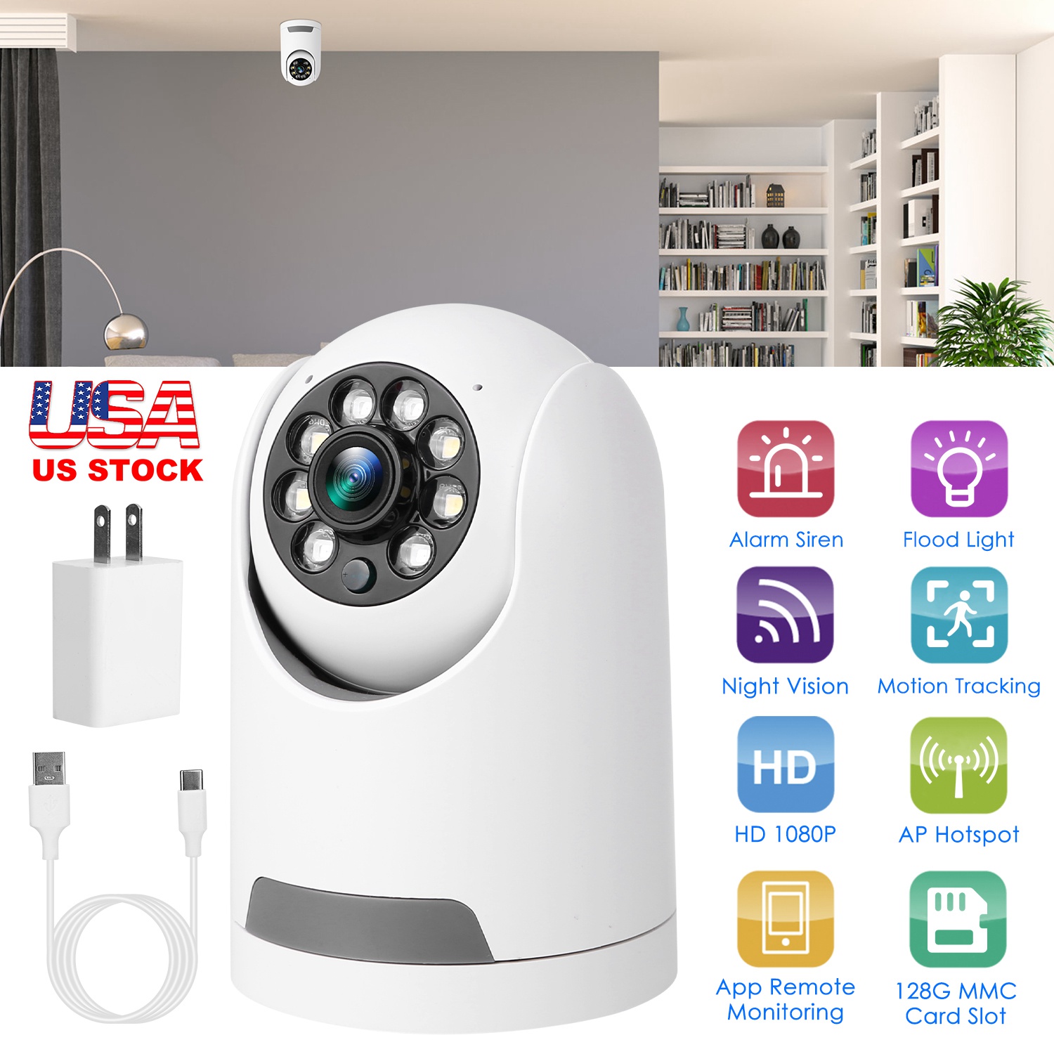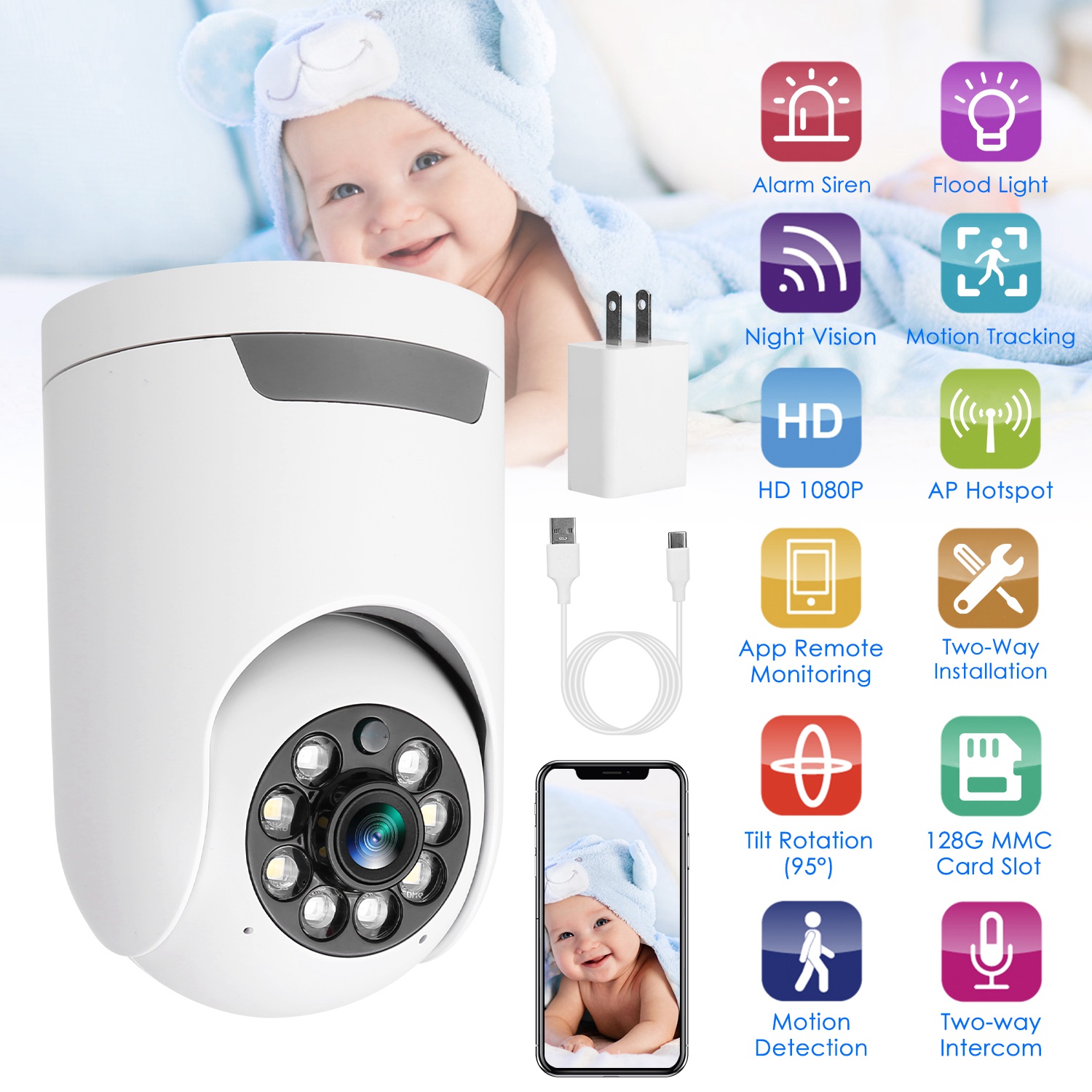 This 1080P WiFi IP Camera is a good helper for you to keep an eye on your home or office for security from anyplace in the world. Easily adjust the camera horizontally 355° or vertically 90° via the APP to monitor with no blind spot. When detect human motion, it can auto track the motion and send notification to your APP in real time. With night vision function and flood light, you can even inform of any happenings at night. Built-in advanced microphone and speaker for a clear 2-way intercom, you can hear and talk to your family members at any time. Moreover, it supports extra MMC card slot(Max 128G) to store the surveillance video for playback on mobile App/PC software and cloud storage service to avoid the risk of losing footage, bringing you much convenience.